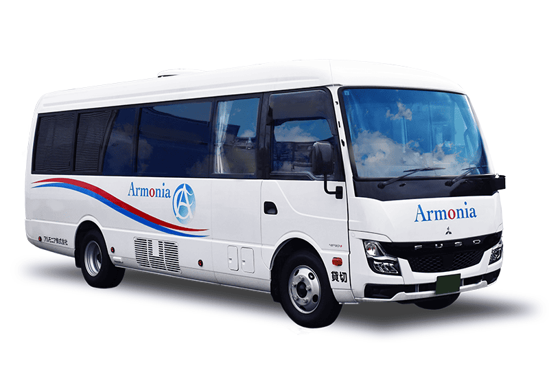 アルモニア株式会社では、大型バス・中型バス・マイクロバス・コミューターバスの4パターンの車種をご用意。